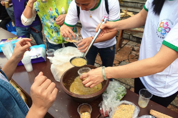 一種“茶” 有獨特的味 拿來一擂缽 把火坑的柴火添足 燒一鍋開水 花生芝麻鮮茶葉放入其中 一種“茶” 有獨特的味 煮上一鍋 勞作完一天 大家聚在一起說說笑笑 一種“茶” 有獨特的味 喝上一碗 讓人想起有一種溫暖 有一份回憶 這是什么茶?大龍擂茶。 這茶什么“味”?是香味、是大龍味、是濃濃的鄉(xiāng)愁味。 ? 一.歷史 大龍擂茶歷史悠久,屬客家擂茶系列。據(jù)史料記載,在宋朝時即有擂茶。 在客家人日常生活中,擂茶既是其主食之一,也是待客之佳肴,在客家人豐富多彩的飲食文化中,擂茶是最具代表性的一種美味。而且其制作方式古樸典雅,充分表現(xiàn)了客家人對中國古代傳統(tǒng)文化之傳承。 大龍客家擂茶繼承優(yōu)良傳統(tǒng),不管哪家遇到喜事,認識還是不認識的,主人都會很熱情招待,讓你能在這里品嘗到這美味,在當?shù)匚幕幸菜闶且坏廓毺氐娘L景了。 ? 二.制作 大龍擂茶分葷素兩種。素的加花生、或綠豆、糯米、青菜、涼菜等;葷的則炒好的肉絲或小腸、甜筍、香菇絲、煎豆腐、粉絲、香蔥等配料。 在基本配料的基礎上,還根據(jù)季節(jié)變化和客人的口味靈活調(diào)整配方:例如冬春一般加生姜、肉桂用以溫通經(jīng)脈、通陽化氣、祛濕驅(qū)寒。夏天可加魚腥草、藿香及當?shù)匾环N稱為“鳳尾草”的草藥,制成防暑擂茶,或加金銀花、荷葉、淡竹葉、薄荷等制成清涼解毒擂茶。秋天可加貢菊或杭白菊。對于喜歡喝香茶的人,可將芝麻炒過再擂,亦可加入炒花生米、炒黃豆等。 ? 三.民俗 擂茶制作完畢,芳香四溢的熱氣,饞得人直流口水,親朋好友圍在桌子上喝著熱氣騰騰的擂茶。 此時,一些瓜果茶點,加上天南地北的聊天,是動手勞作后快樂的延伸。大家聊得興起,眼疾手快的主人操起竹筒勺子或是木制勺子,吧達吧達,給每個手拿空碗的人重新添滿。 大龍喝擂茶有個不成文的規(guī)矩,剛剛喝下去一點,好客的女主人就會操起勺子給你重新添滿。因此,喝起來就沒完沒了。 所以,按照當?shù)氐牧曀祝绻愫韧晔掷锏倪@一碗不想喝了,那你就讓它留在碗內(nèi),等到臨走離開主人家時,再一口氣喝完,然后告辭。