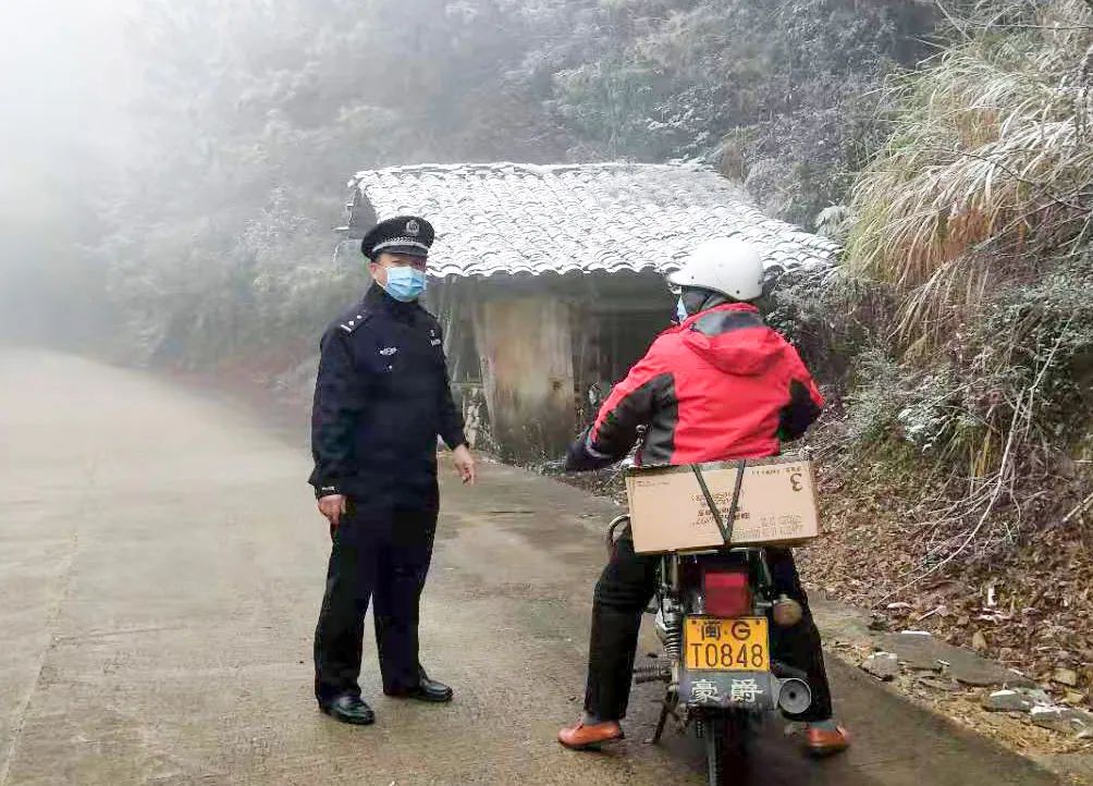 江華立即帶領戶籍民警開展走訪調查,并積極與肖某原戶籍地派出所及村委會溝通協助出具相關證明。材料集齊后,經逐級審批,最終,民警順利為肖某補錄了戶口并辦理了身份證。拿到戶口本的肖某握住江華的手連聲道謝,并送來一面寫著“人民衛士 一心為民”的錦旗表達對民警的感激之情。 擔當奉獻,堅守崗位守平安 冬天的新橋鄉,高山環繞,與江西、南平交界,車流量大。每當這時,都能在路上看到江華的身影。他經常在雨雪交加的時候前往結冰路段擺放警示牌、指揮交通。