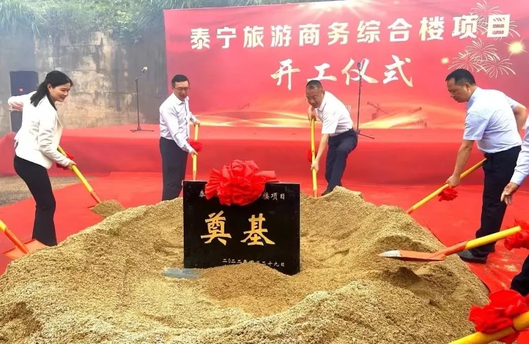 隨后,縣領導和嘉賓們?yōu)樘幝糜紊虅站C合樓項目培土奠基,共同祝愿泰寧旅游商務綜合樓項目早日建成。