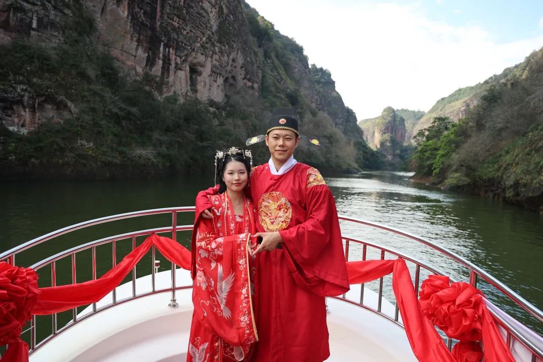 新人領(lǐng)證婚書 活動現(xiàn)場舉辦百人中式集體婚禮,其中為12對新人開展戶外頒證儀式,通過合巹禮、解纓結(jié)發(fā)、共書婚帖等方式完成傳統(tǒng)儀式,溯源婚俗歷史,再現(xiàn)跨越千年的良緣之美,感受中式婚禮民俗文化,展現(xiàn)現(xiàn)代特色的集體婚禮文化。婚禮流程結(jié)束后,縣領(lǐng)導(dǎo)為新人們證婚,并向新人發(fā)婚書。 “今天的活動很有儀式感,以前有了解過集體婚禮,參加后,有些許緊張,但是感覺很幸福?!毙氯私嗔琳f。 “十分開心能和大家一塊兒舉辦婚禮,我們都感到非常幸福?!毙氯笋T珍珠表示。 此次活動內(nèi)容豐富,精彩紛呈,涵蓋了中式婚禮多個儀式,讓廣大游客和市民在觀看婚禮的同時,也感受中華文化的深厚底蘊(yùn)?;顒雍螅氯藗冞€參觀了古城、大金湖等景區(qū),漫步在古城千年古巷的青石板,與甘露寺相約抱如意柱,共同祈福,在鴛鴦湖牽線情侶峰,大赤壁、仙壽山作證海誓山盟,定下白首之約。