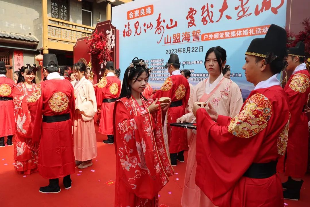 地闊天高雙飛翼,月圓花好兩心知!2023年8月22日農(nóng)歷七夕節(jié)上午,12對新人戶外頒證儀式、百人中式集體婚禮活動在三明市泰寧縣成功舉辦。省民政廳二級巡視員張六,市委常委、副市長王軍強(qiáng),市民政局局長鄧秀廣,總工會副主席李伸安,泰寧縣委副書記、縣長王懷斌等相關(guān)領(lǐng)導(dǎo)作為嘉賓出席。