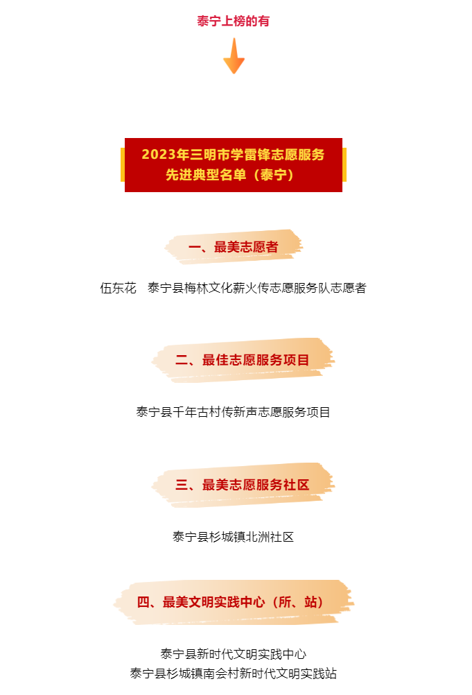 為總結(jié)經(jīng)驗、激勵先進、樹立典型,完善志愿服務(wù)激勵機制,進一步增強志愿者的積極性和榮譽感,按照《三明市精神文明建設(shè)指導委員會辦公室關(guān)于組織開展2023年全市學雷鋒志愿服務(wù)先進典型宣傳推選活動的通知》(明文明委辦〔2023〕8號)精神,經(jīng)過宣傳發(fā)動,擇優(yōu)推薦、專家評審、部門協(xié)審、網(wǎng)站公示等環(huán)節(jié),推選出陳根發(fā)等9名“最美志愿者”,三明市政協(xié)志愿服務(wù)隊等11個“最佳志愿服務(wù)組織”,三明市城市管理局快樂“分”享志愿服務(wù)項目等9個“最佳志愿服務(wù)項目”,三元區(qū)列東街道一路社區(qū)等11個“最美志愿服務(wù)社區(qū)”,三元區(qū)新時代文明實踐中心等16個“最美新時代文明實踐中心(所、站)”。