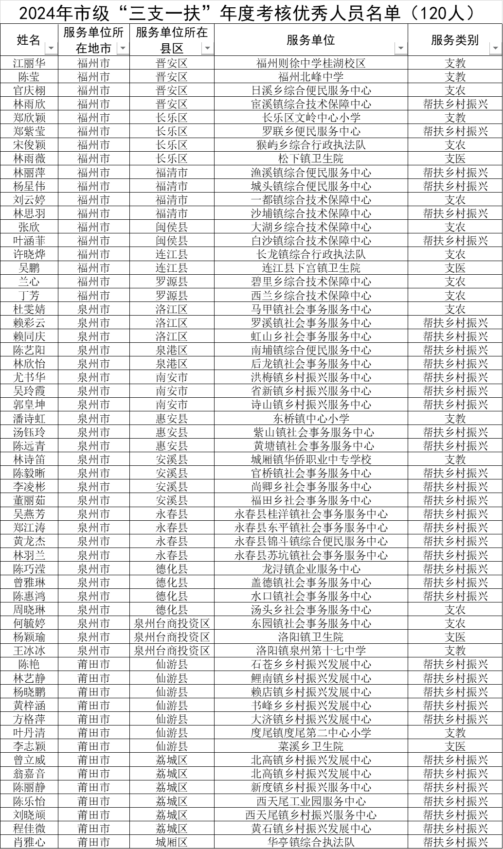 2024年省級“三支一扶” 期滿考核優(yōu)秀人員名單 (251人) 其中,泰寧6人上榜