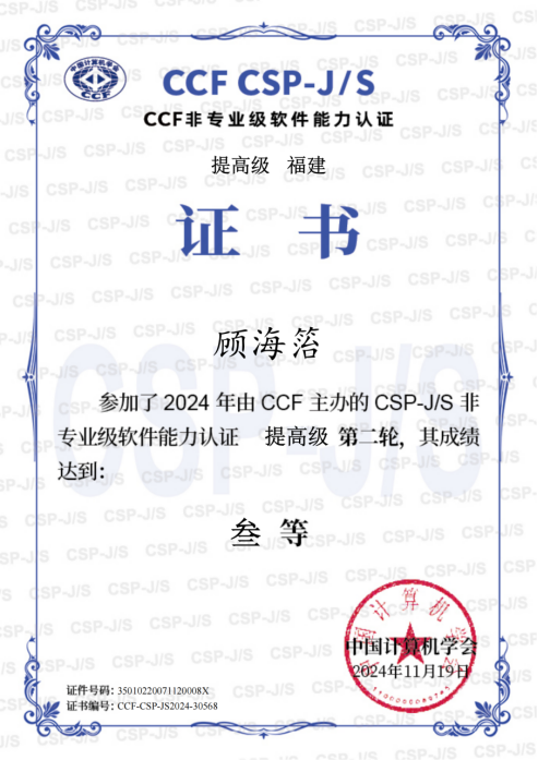 此次比賽分為CSP-J(入門級)和CSP-S(提高級)兩個組別,每個組別分別進行兩輪認證,CCF根據評級規則及名額分配,最終確定各省提高級及入門級一等分數線。 泰寧縣第一中學共5人參加, 他們在比賽中沉著發揮, 比出了水平、賽出了風格, 最終取得了可喜的成績 。 其中,在 CSP-S(提高級)競賽中黃健博、顧海箈、江芝晗獲評省三等獎。