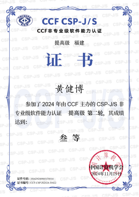在CSP-J(入門級)競賽中,黃健博獲評省二等獎,楊鍇鑫、江芝晗獲評省三等獎。