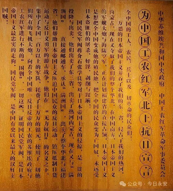 為了進一步推動抗日運動的發展,1934年夏,在中央蘇區第五次反“圍剿”的關鍵時刻,中共中央決定以紅七軍團組成中國工農紅軍北上抗日先遣隊,向閩浙皖贛地區出動,宣傳中國共產黨的抗日主張。同年7月7日,尋淮洲任軍團長、樂少華任軍團政治委員、曾洪易任隨軍中央代表、粟裕任軍團參謀長、劉英任軍團政治部主任的紅軍北上抗日先遣隊6000余人,攜帶160萬份宣傳單、宣言等抗日宣傳品,由江西瑞金出發,進入福建。7月15日,北上抗日先遣隊進入永安小陶的洪砂一線與掩護北上抗日先遣隊的羅炳輝率領的紅九軍團先頭部隊集結會師。同日,中華蘇維埃政府主席毛澤東,中國工農紅軍革命軍事委員會主席朱德,副主席周恩來、王稼祥等聯名發布《為中國工農紅軍北上抗日宣言》,同時中國工農紅軍北上抗日先遣隊發表《我們是中國工農紅軍北上抗日先遣隊》《中國工農紅軍北上抗日先遣隊告農民書》?!缎浴沸剂恕芭汕蚕惹碴牨鄙峡谷铡钡男袆泳V領及目的,表示“中國工農紅軍北上抗日先遣隊愿意同全中國的民眾一起,以民族革命戰爭,打倒日本帝國主義”。三個宣言書的同日發布,使永安成為中國工農紅軍北上抗日先遣隊集結地和宣言的發布地,也為永安抗戰文化的形成和發展奠定了堅實的政治基礎和群眾基礎。