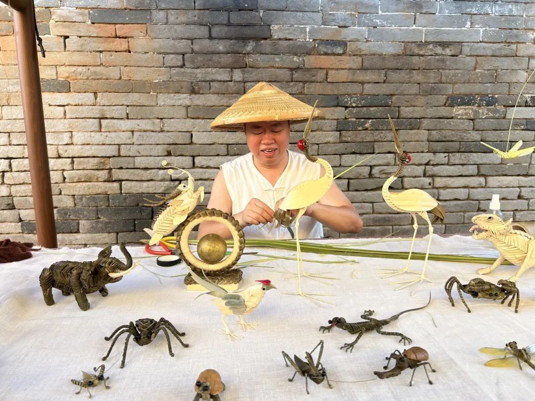 走進泰寧古城的進士巷,楊海雄正低頭專注地擺弄著一片棕櫚葉。指尖翻飛間,葉脈被巧妙折疊、穿插,半小時后,一只振翅欲飛的棕編螞蚱便躍然手中。作為泰寧棕編市級非遺傳承人,楊海雄正用一雙巧手讓這項千年技藝在當代煥發新活力。 上青棕編傳承人楊海雄:“棕編是我小的時候在放牛過程中向老一輩人學習的傳統手工藝。記得小時候老人家帶我們去山上放牛,他們常常會編織蜻蜓、螞蚱等小動物造型的棕編作品。在耳濡目染之下,我逐漸掌握了這門技藝。自十一二歲初次接觸至今,我從事棕編創作已近三十年。”