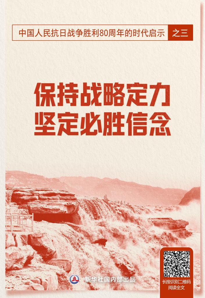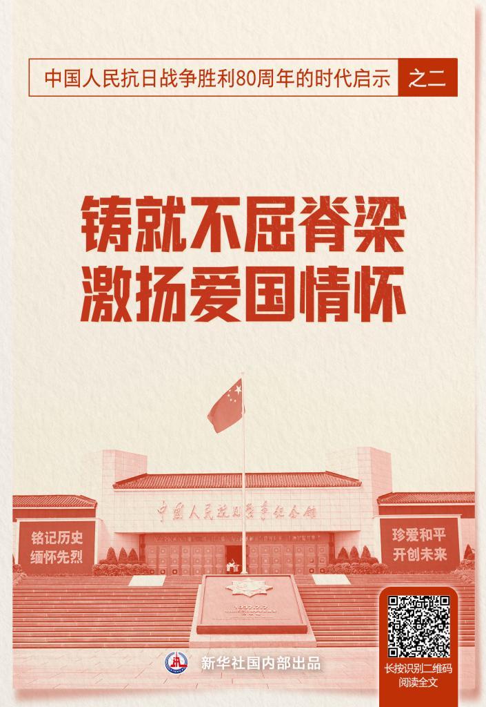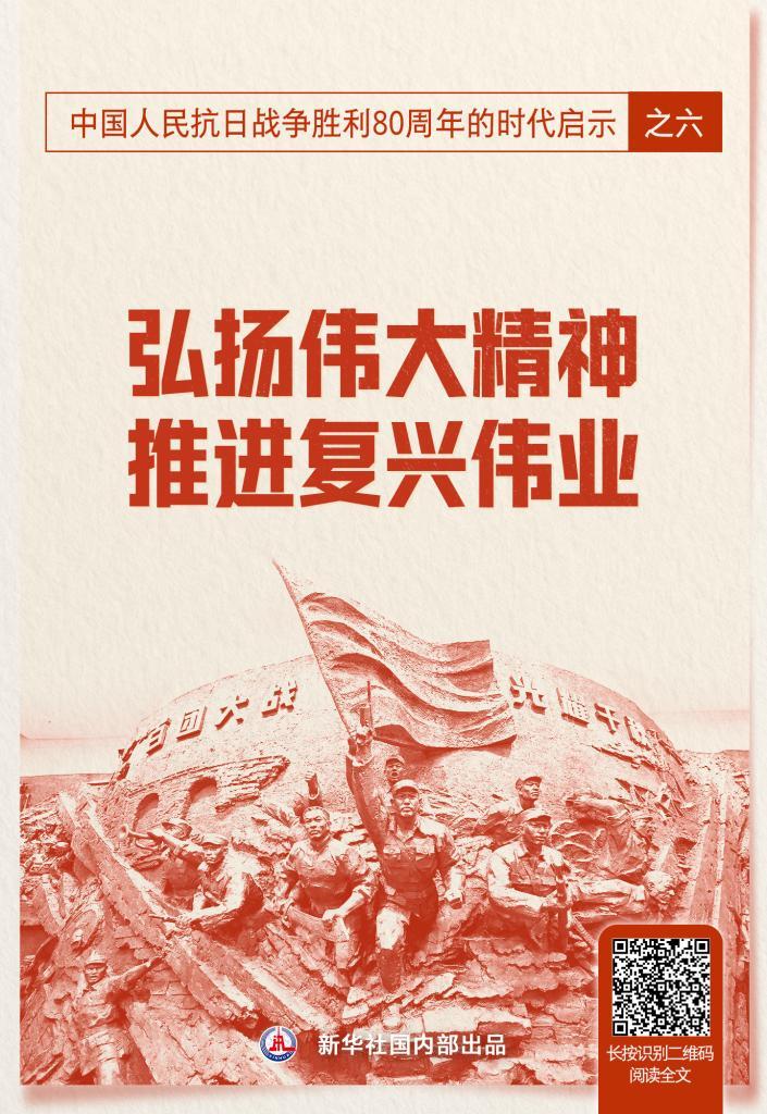 從沉淪走向榮光,從挫折走向復興。 歷史的回響昭示未來:實現中華民族偉大復興,必須堅持中國共產黨領導。 掃描海報二維碼,閱讀全文↓ 中國人民抗日戰爭勝利是以愛國主義為核心的民族精神的偉大勝利。 愛國主義精神構筑起民族的脊梁,召喚著一代代中華兒女為國家和民族發展奮斗不息。 掃描海報二維碼,閱讀全文↓ 什么樣的力量,能夠穿越歷史的風云,指引前行的路? 什么樣的信念,能夠超越生死利害,只為那必須贏得的勝利? 掃描海報二維碼,閱讀全文↓ 團結奮斗是中國共產黨和中國人民最顯著的精神標識。 歷史已經并將繼續證明:團結就是力量,奮斗開創未來! 掃描海報二維碼,閱讀全文↓ 世界歷史曲折向前,和平與發展的時代大潮浩浩蕩蕩。 銘記艱苦卓絕的奮戰,邁上昂揚奮進的新征程,為促進世界和平與發展注入新的強大動能。 掃描海報二維碼,閱讀全文↓ 一部血與火的戰爭史,一部民族精神的熔鑄史。 波瀾壯闊的抗日戰爭,孕育出怎樣的偉大抗戰精神? 從崢嶸歲月走來,這座精神長城永遠屹立不倒。 掃描海報二維碼,閱讀全文↓ |