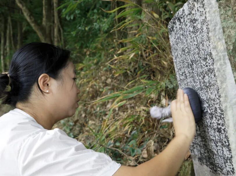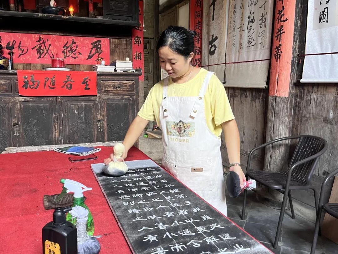 ▲朱熹《四季詩》 由于從小便跟著爺爺和母親做幫手,梁臻對拓印和字畫裝裱早已輕車熟路。2020年,她正式接手梁氏拓印與裝裱工作,成為“梁氏拓印裝裱”傳承人。在繼承與發揚梁氏拓印、字畫裝裱技藝的實踐中,她更以女性獨有的細膩與韌性,為這門老手藝注入新活力。她積極挖掘地方特色元素、雕刻拓版,融入拓印實踐;將古老技藝帶出深宅,鋪展于山石之間,讓沉睡的古老文字通過拓印,走進當代人的視野與生活。