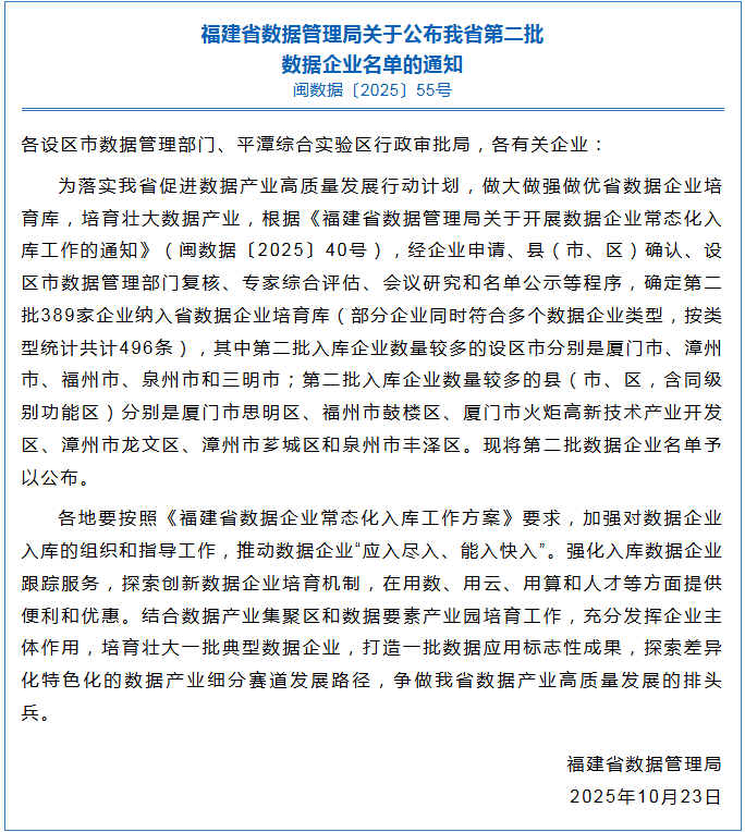 近日, 省數據管理局公布了 全省第二批數據企業名單, 泰寧縣3家企業 成功入選省數據企業培育庫。 分別是—— 福建財通信息科技有限公司 三明市宏彩光電科技有限公司 泰寧易通電子科技有限公司 其中,福建財通信息科技有限公司同時符合數據服務企業,數據應用企業,數據技術企業等3個數據企業類型,即按類型統計,泰寧縣共計5條數據企業信息納入省數據企業培育庫。