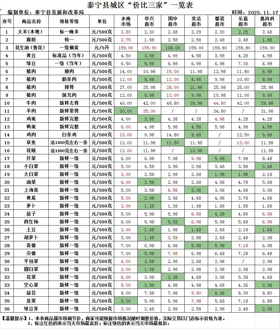 近期,為做好重要民生商品保障需求,保持市場價格穩定,維護正常市場秩序,縣發改局從城區水南市場、華興超市、國中超市、美潔超市、馨語超市、樂嘉超市、惠尚科超市抽取當天36種商品的價格,通過價格對比,讓廣大市民直觀地看到貨品價格。